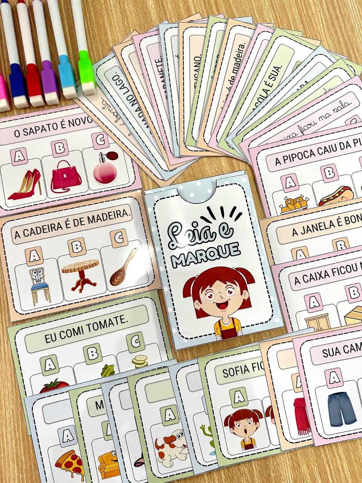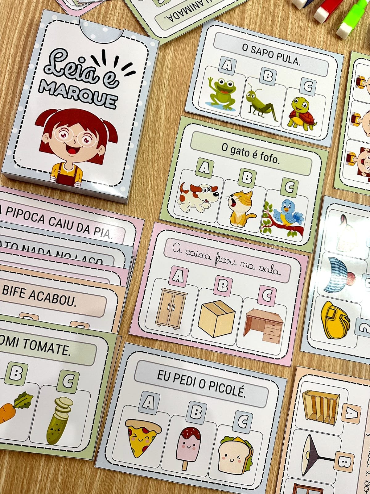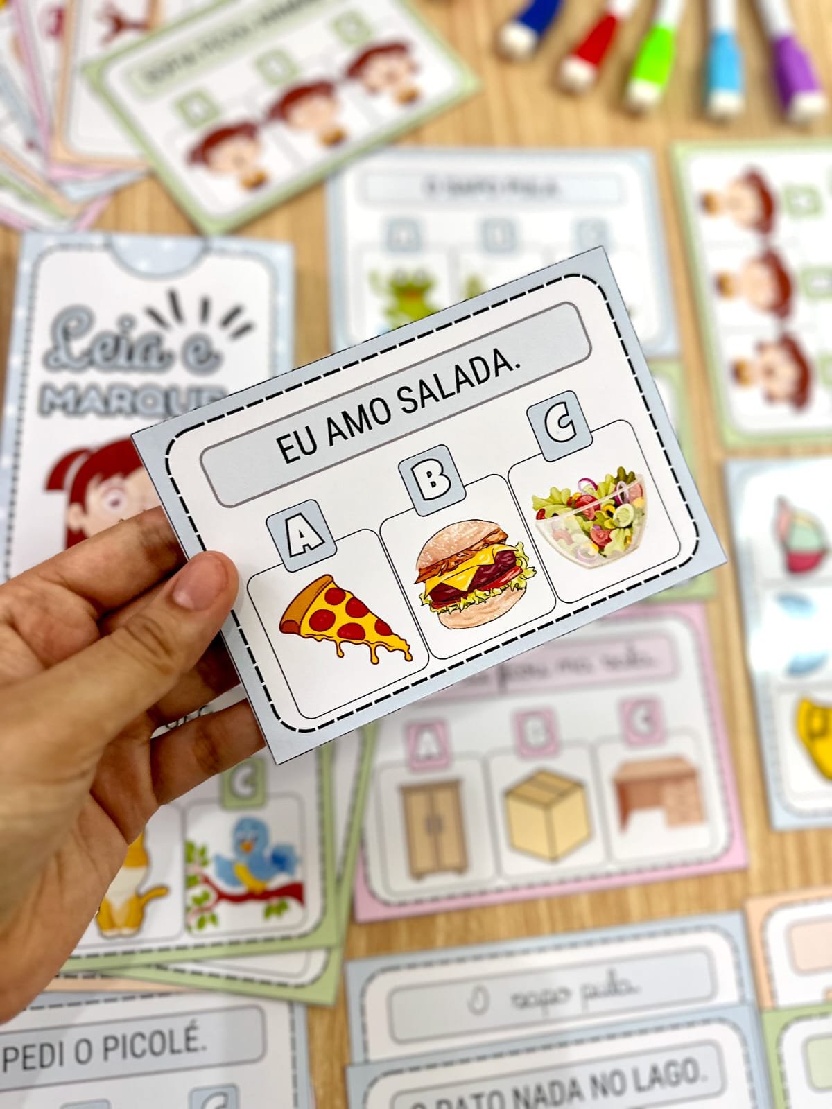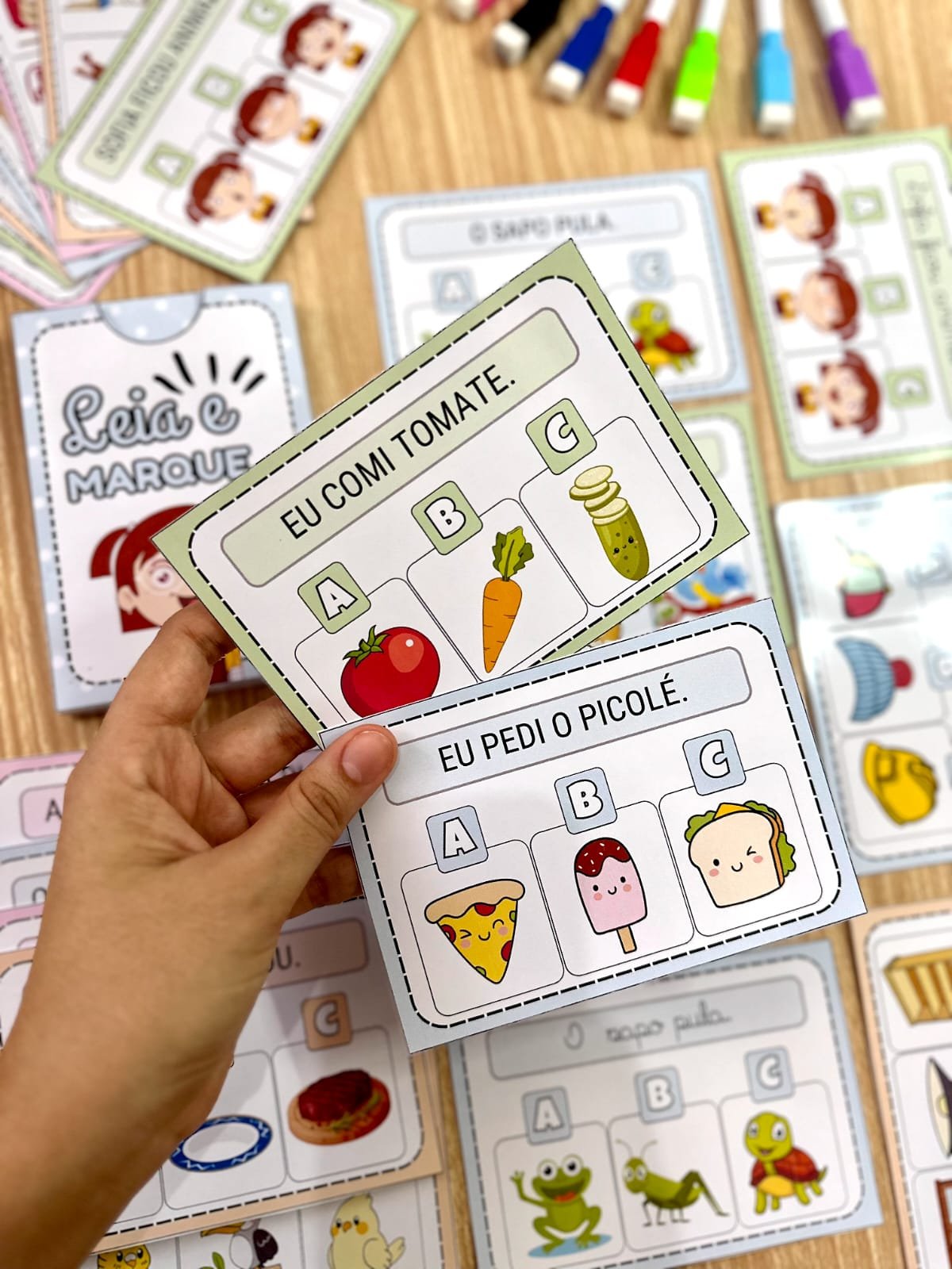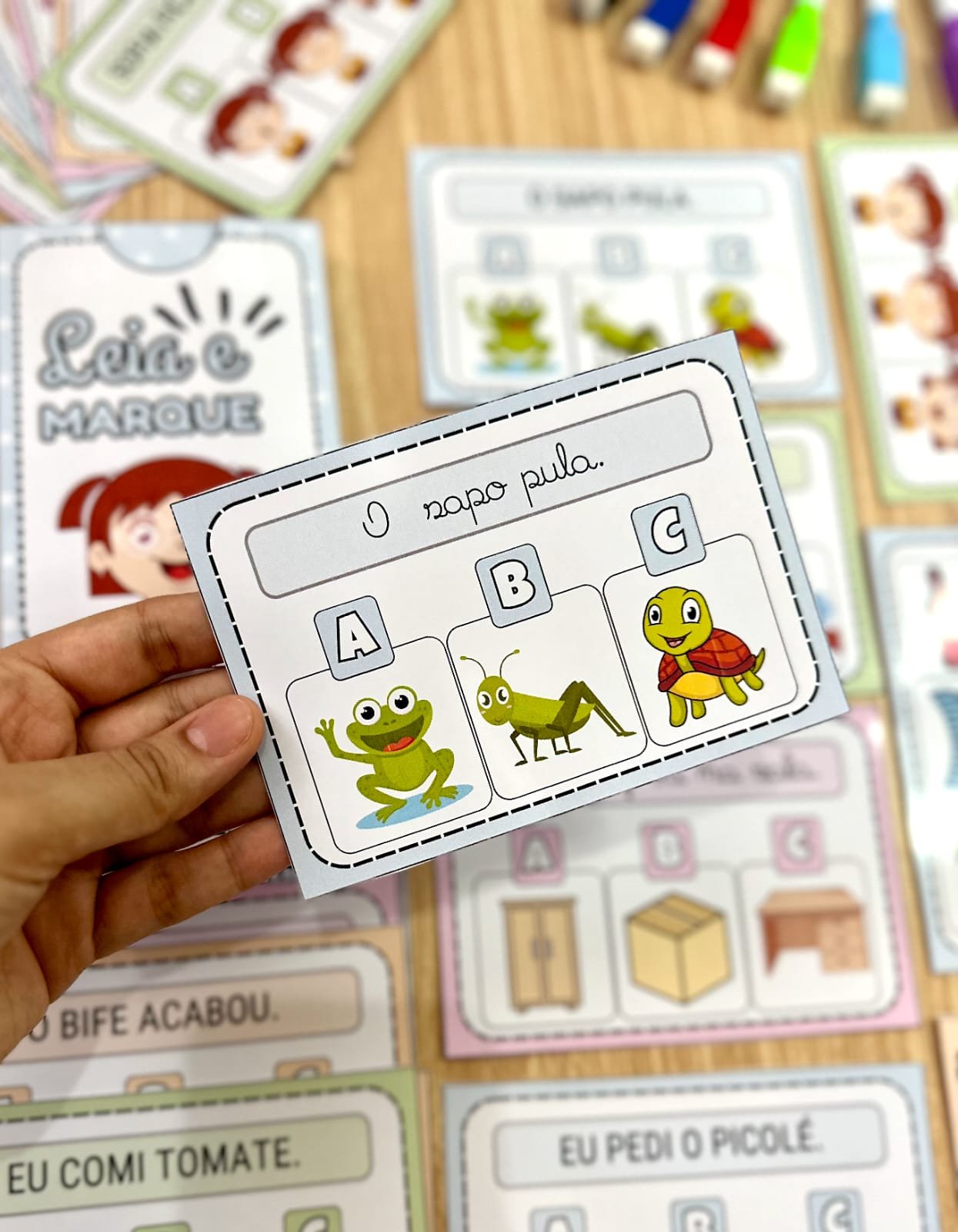 ⏩️O arquivo Leia e Marque inclui 20 frases diferentes para a criança realizar a leitura, identificar e marcar qual imagem corresponde a frase.
