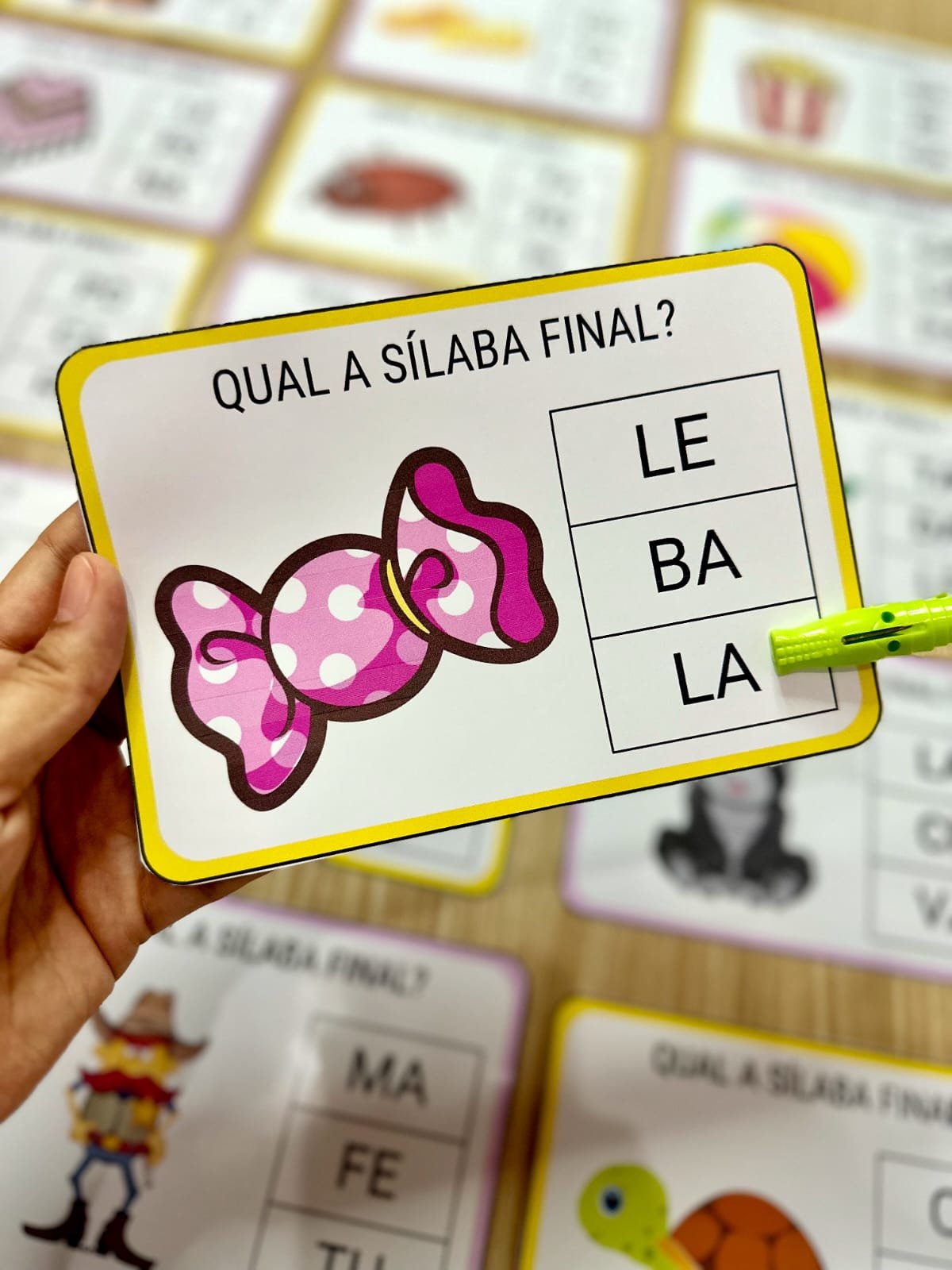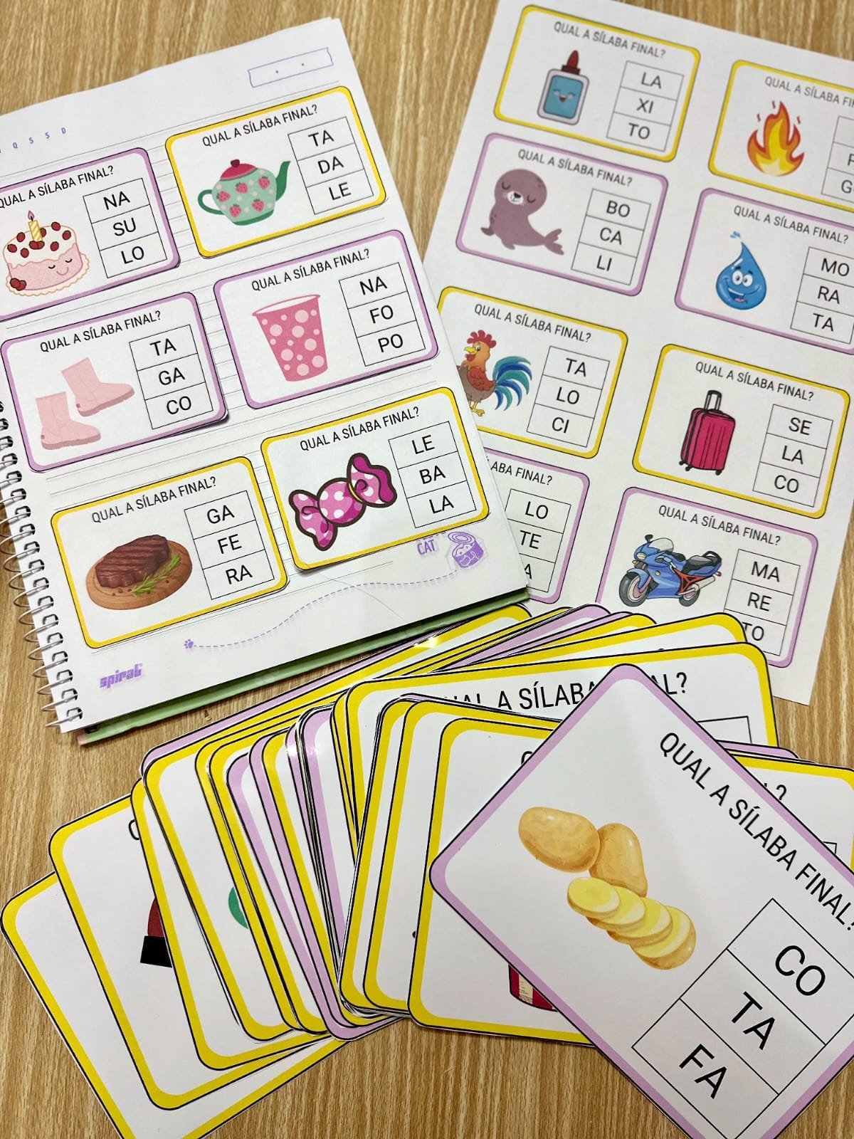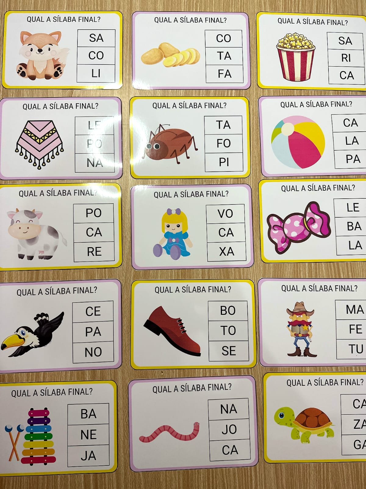 ⏩️O Recurso “Qual é a Sílaba final” inclui 36 fichas trabalha a consciência silábica de forma eficiente, pois a criança precisa pensar sobre a formação da palavra em destaque, e identificar qual é a sonoridade da última sílaba da palavra, e fazer a associação com a sua representação gráfica.